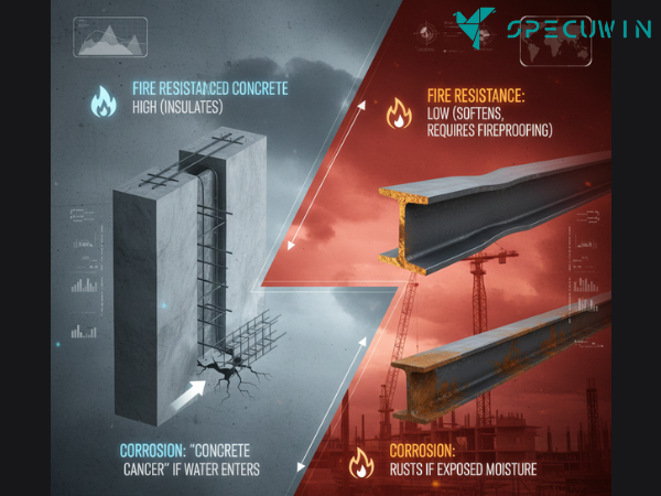 A. Both can last over 100 years if maintained. However, concrete generally requires less maintenance regarding fireproofing and corrosion protection. Steel needs regular inspections to ensure the protective coatings (paint or fireproofing) remain intact to prevent rust.